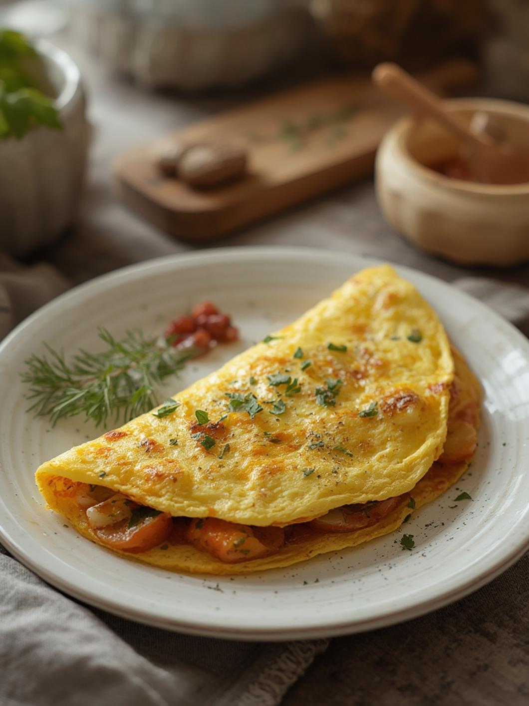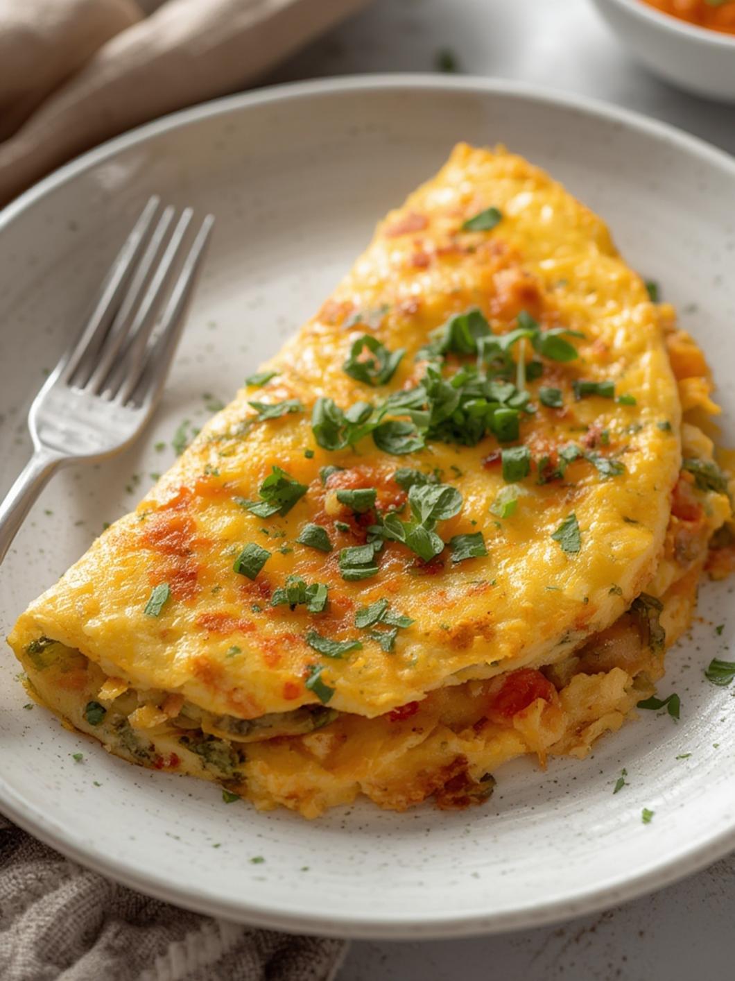 6. Serve: Carefully slide the omelette onto a plate. Garnish with extra herbs or veggies, if desired, and serve immediately!