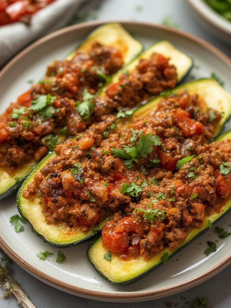 6. Fill the Zucchini Boats: Place the zucchini halves in a baking dish. Spoon the beef mixture evenly into each boat, packing it slightly.