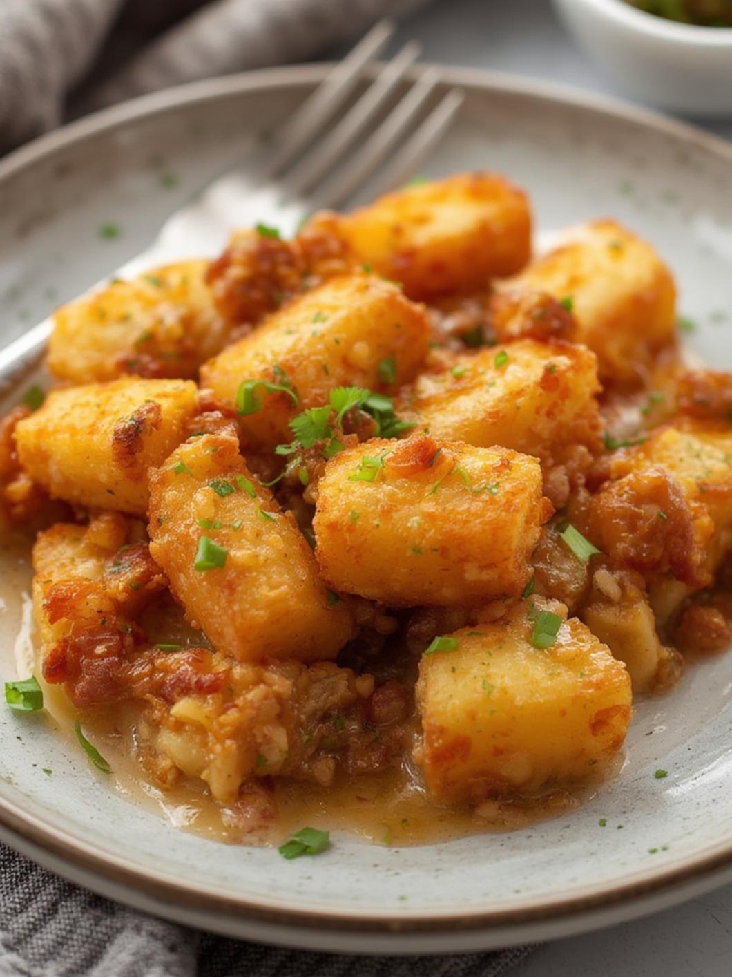 6. Bake: Bake in the preheated oven for about 20 minutes, or until the tater tots are golden brown and crispy. In the last 5 minutes of baking, sprinkle the remaining cheese on top, allowing it to melt.