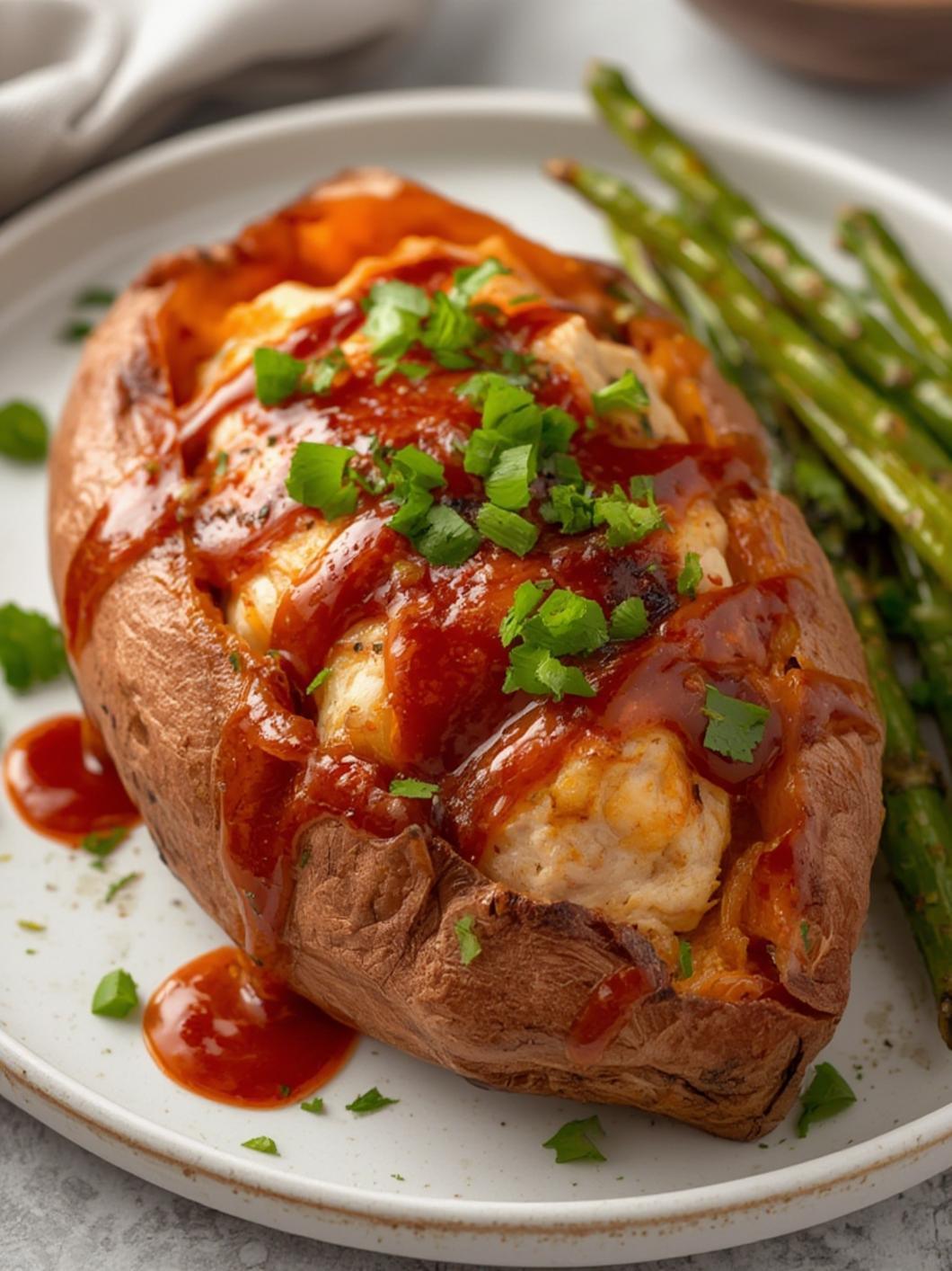 5. Stuff the Sweet Potatoes: Once the sweet potatoes are baked and cooled slightly, carefully unwrap them. Cut each potato in half lengthwise and gently fluff the insides with a fork. Spoon the BBQ chicken mixture generously into each potato half.