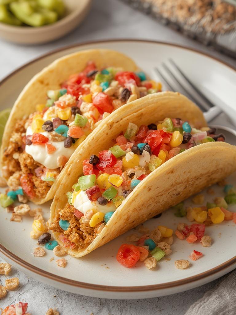 6. Top with More Fruity Pebbles: Sprinkle the remaining 1/4 cup of Fruity Pebbles on top of each taco for an extra layer of crunch and color.