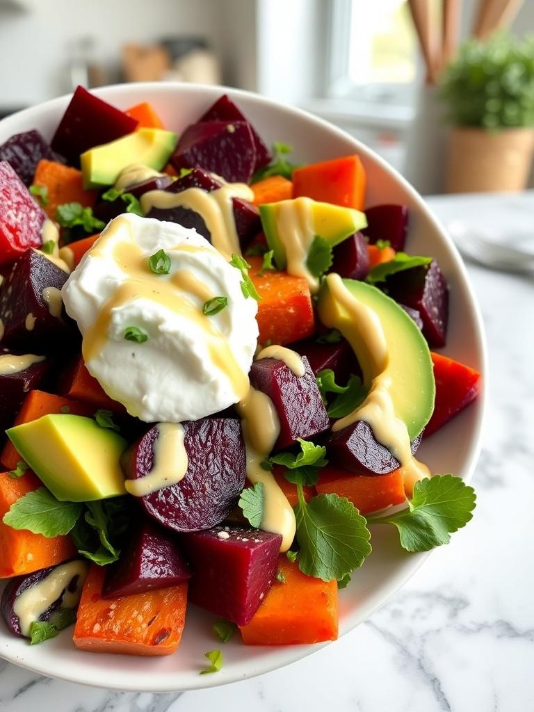 Roasted beet and sweet potato salad is a powerhouse of flavors and nutrients, making it a perfect choice for busy weeknight dinners or meal prep. Combining earthy roasted beets, sweet, tender sweet potatoes, creamy avocado, and a delightful whipped ricotta topped with a zesty lemon-tahini drizzle, this dish is not only healthy but also incredibly satisfying. Let’s dive into how to create this delicious salad efficiently!