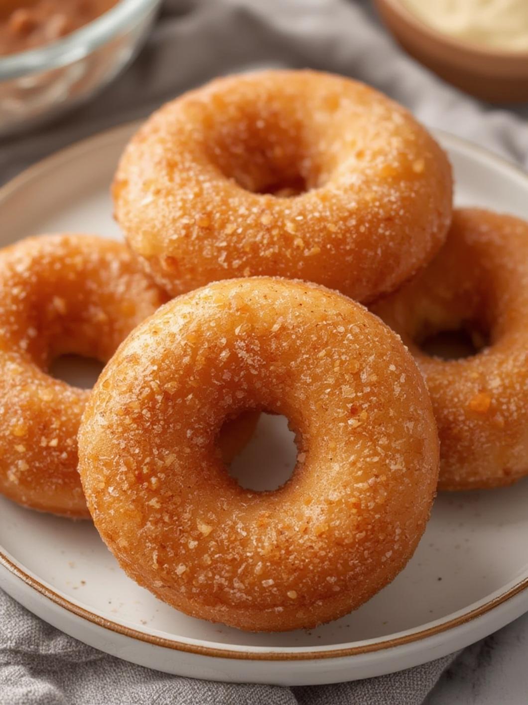 8. Coat the Donuts: Once the donuts are slightly cooled, dip them in the sugar mixture, making sure to coat them on all sides.